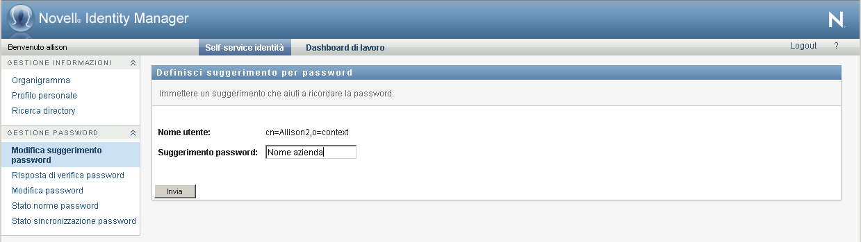 Un suggerimento per la password viene utilizzato durante il login per facilitare la memorizzazione della password qualora venisse dimenticata. È possibile utilizzare la pagina Cambio suggerimento password per impostare o modificare il suggerimento.