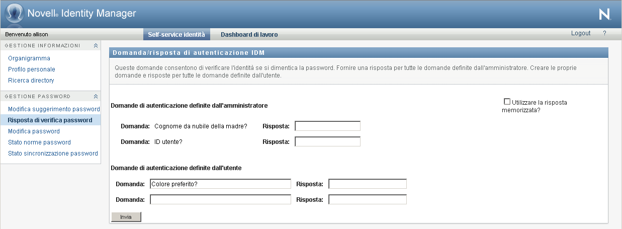 specificare le domande e le risposte valide corrispondenti (se questa operazione è abilitata dalle norme della password).