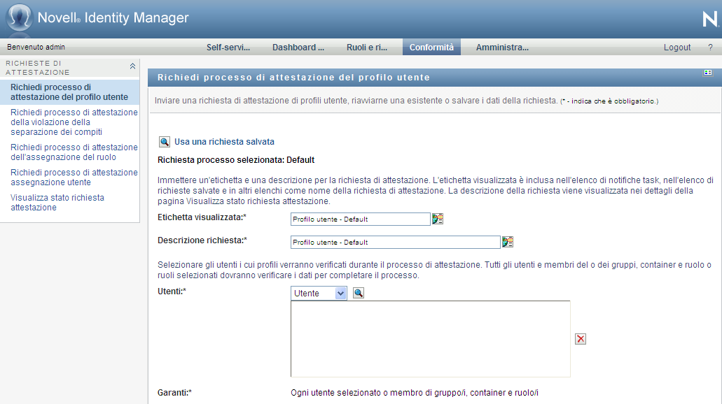 Per default, nella scheda viene visualizzata la pagina Richiedi processo di attestazione del profilo utente.