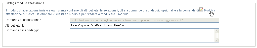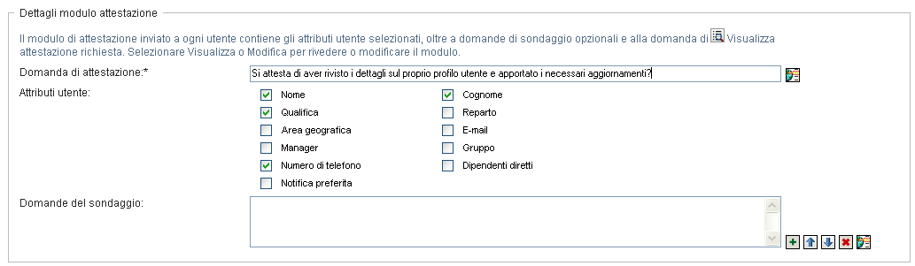 Nel campo è possibile includere facoltativamente una o più domande a cui un garante può rispondere durante l'esecuzione di un processo di attestazione. Non è obbligatorio un processo di attestazione per includere le domande del sondaggio. Se tuttavia le domande vengono incluse, possono facoltativamente ricevere la risposta del garante.