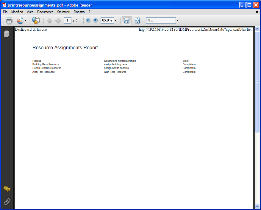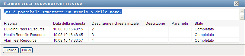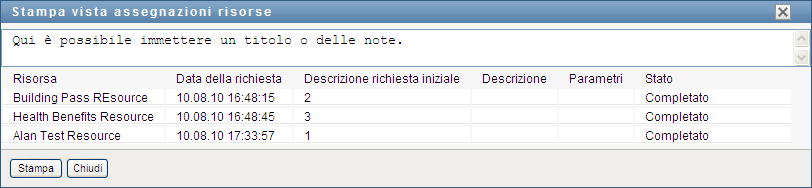 Nella sezione del dashboard è possibile stampare l'elenco delle assegnazioni risorse visualizzato nella pagina. Ciò che viene visualizzato sullo schermo corrisponde sostanzialmente alla stampa dell'elenco delle assegnazioni risorse, eccetto per il fatto che la stampa include solo il testo visualizzato sullo schermo. Tutte le immagini visualizzate nella colonne o non sono visibili nella stampa.