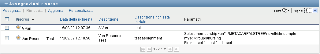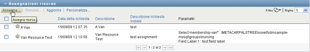 Viene visualizzato l'elenco delle risorse. Se non si è in modalità gestita, le assegnazioni di risorse mostrate sono quelle per le quali si è il destinatario. Se si è in modalità gestita, le assegnazioni di risorse mostrate sono quelle per le quali l'utente, il gruppo o il container selezionato è il destinatario. Per gruppi e container, le risorse elencate sono quelle assegnate indirettamente al gruppo o al container selezionato attraverso le assegnazioni di ruoli. L'elenco delle assegnazioni di risorse per un gruppo o un container non include le risorse assegnate direttamente a un utente all'interno del gruppo o del container selezionato.