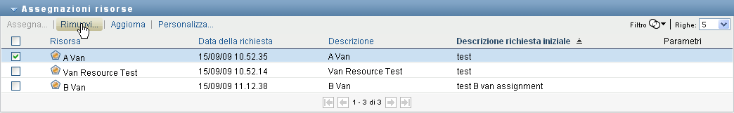 Specificare una stringa di filtro per la descrizione della richiesta iniziale, il nome della risorsa, la descrizione o i parametri associati all'assegnazione della risorsa.