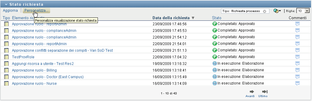 Per visualizzare il tipo di richiesta, è necessario includere la colonna nell'elenco di colonne per la visualizzazione. Quando la colonna è inclusa, l'applicazione utente mostra un'icona indicante se la richiesta era di processo (provisioning), di ruolo o di risorsa.