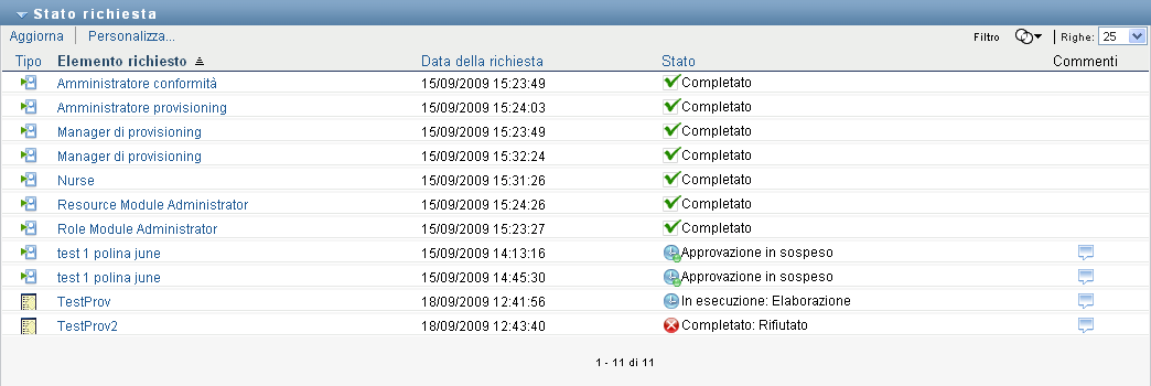 NOTA:se l'orologio di sistema del server in cui risiede il driver servizi dei ruoli non è sincronizzato con l'orologio di sistema del server in cui è in esecuzione l'applicazione dell'utente, lo stato della richiesta può risultare diverso negli elenchi Stato richiesta e Assegnazioni ruoli. Ad esempio, se si richiede un'assegnazione di ruolo che non richiede approvazione, è possibile che lo stato venga visualizzato come Provisioning effettuato nella sezione Stato richiesta e come Attivazione in sospeso nella sezione Assegnazioni ruoli. Se si attende circa un minuto, è possibile che lo stato nella sezione Assegnazioni ruoli venga modificato in Provisioning effettuato. Per assicurarsi che lo stato venga sempre visualizzato correttamente nell'applicazione utente, controllare che gli orologi del sistema siano sincronizzati in modo adeguato.