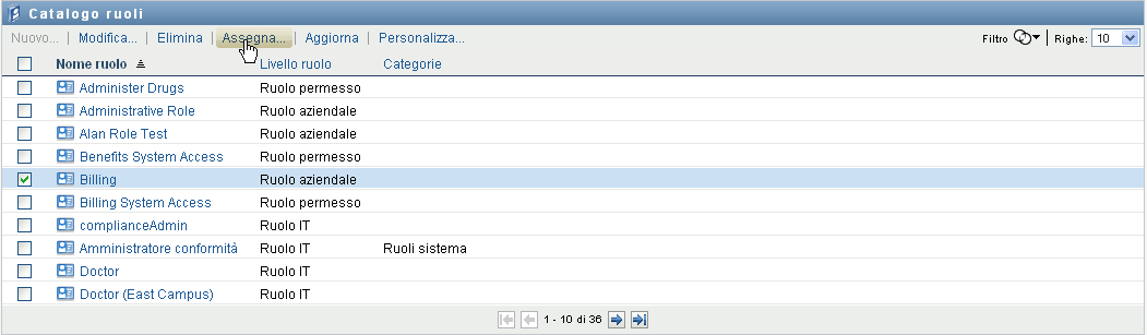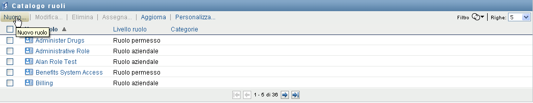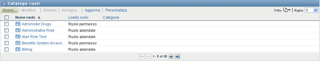 L'azione nella scheda dell'interfaccia utente di Identity Manager consente di visualizzare ruoli definiti in precedenza nel catalogo. Consente inoltre di creare nuovi ruoli e modificare, eliminare ed assegnare ruoli esistenti.