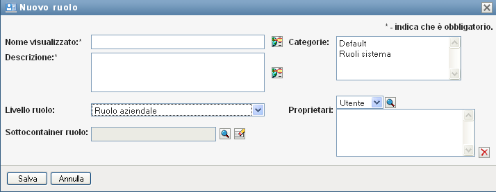 Gli utenti designati come proprietari della definizione del ruolo. Quando si generano rapporti per il Catalogo dei ruoli, è possibile applicare un filtro in base al proprietario del ruolo. Il proprietario di un ruolo non dispone automaticamente dell'autorizzazione per l'amministrazione delle modifiche alla definizione del ruolo specificato. |