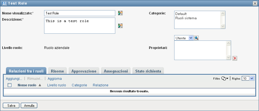 Consente di classificare i ruoli per la relativa organizzazione. Le categorie vengono utilizzate per filtrare l'elenco dei ruoli. Le categorie sono a selezione multipla. |