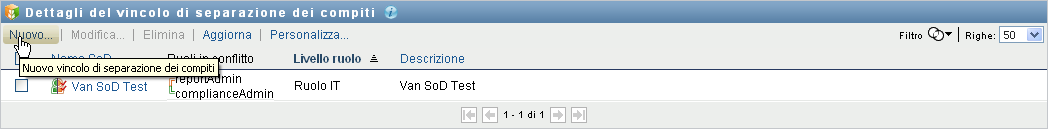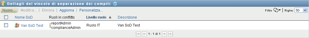 Nell'applicazione utente viene visualizzato un elenco di vincoli di separazione dei compiti attualmente definito nel catalogo.