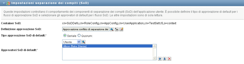 Selezionare se il task di approvazione del ruolo deve essere assegnato a uno o più utenti. Scegliere se il task di approvazione del ruolo deve essere assegnato a un gruppo. Solo un membro del gruppo necessita dell'approvazione. Scegliere se il task di approvazione del ruolo deve essere assegnato a un ruolo. Come per i gruppi, solo un membro del ruolo deve essere approvato. Per individuare un utente, un gruppo o un ruolo specifico, utilizzare i pulsanti Selettore oggetti o Cronologia. Per cambiare l'ordine degli approvatori nell'elenco o per rimuovere un approvatore, vedere Sezione 1.4.4, Azioni comuni degli utenti. |