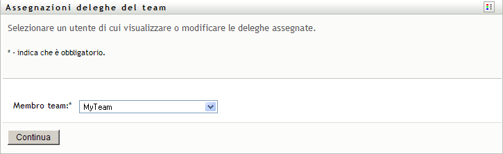 L'elenco dei team include i team per i quali i manager possono definire le deleghe (come specificato nei diritti di richieste del team) nonché i team per i quali l'impostazione delle deleghe è disabilitata. Se una particolare definizione non consente ai manager del team di definire le deleghe, i manager possono ancora visualizzare le impostazioni delle deleghe definite per i membri del team dall'amministratore o dal manager di un altro team a cui gli utenti appartengono. Il manager del team non può tuttavia modificare queste impostazioni, visualizzarne i dettagli o creare nuove assegnazioni di deleghe.