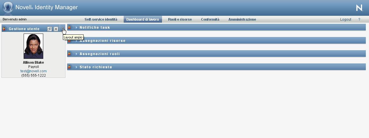 La sezione Profilo utente nasconde i dettagli sull'entità attualmente selezionata per offrire più spazio per lavorare con le sezioni Notifiche task, Assegnazioni risorse, Assegnazioni ruoli e Stato richiesta della pagina.
