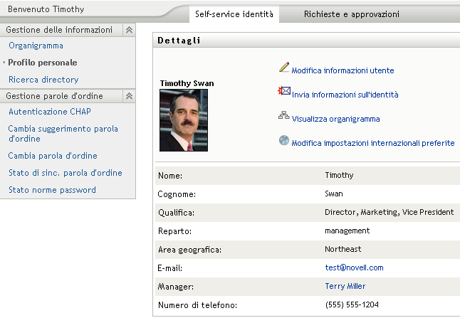 Nello scenario seguente viene illustrato come un utente può utilizzare i collegamenti ai dettagli di un altro utente o gruppo. Timothy Swan, Vicepresidente del reparto Marketing, esegue il login all'applicazione utente di Identity Manager e passa alla pagina Profilo Personale: