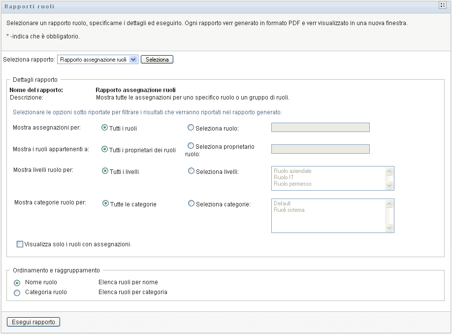 Se si sceglie di visualizzare le assegnazioni di tutti i ruoli anziché di un solo ruolo, in scegliere se raggruppare i ruoli per nome o categoria.