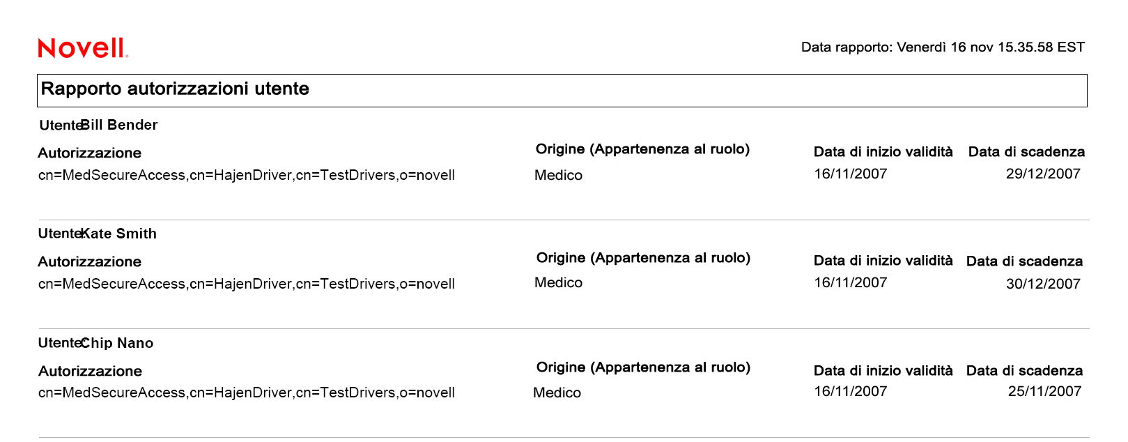 Figura 18-6 Esempio di Rapporto autorizzazioni utente: dettagli autorizzazione per ogni utente