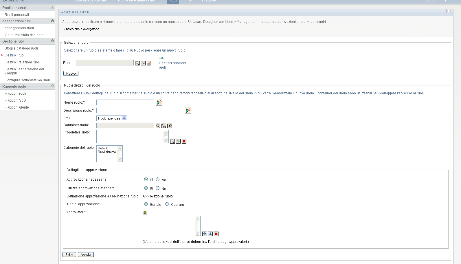 L'applicazione utente richiede di specificare un nella sezione della pagina Gestisci ruoli. Per ulteriori informazioni su ogni campo di questa sezione, vedere Tabella 17-2, Dettagli del ruolo.