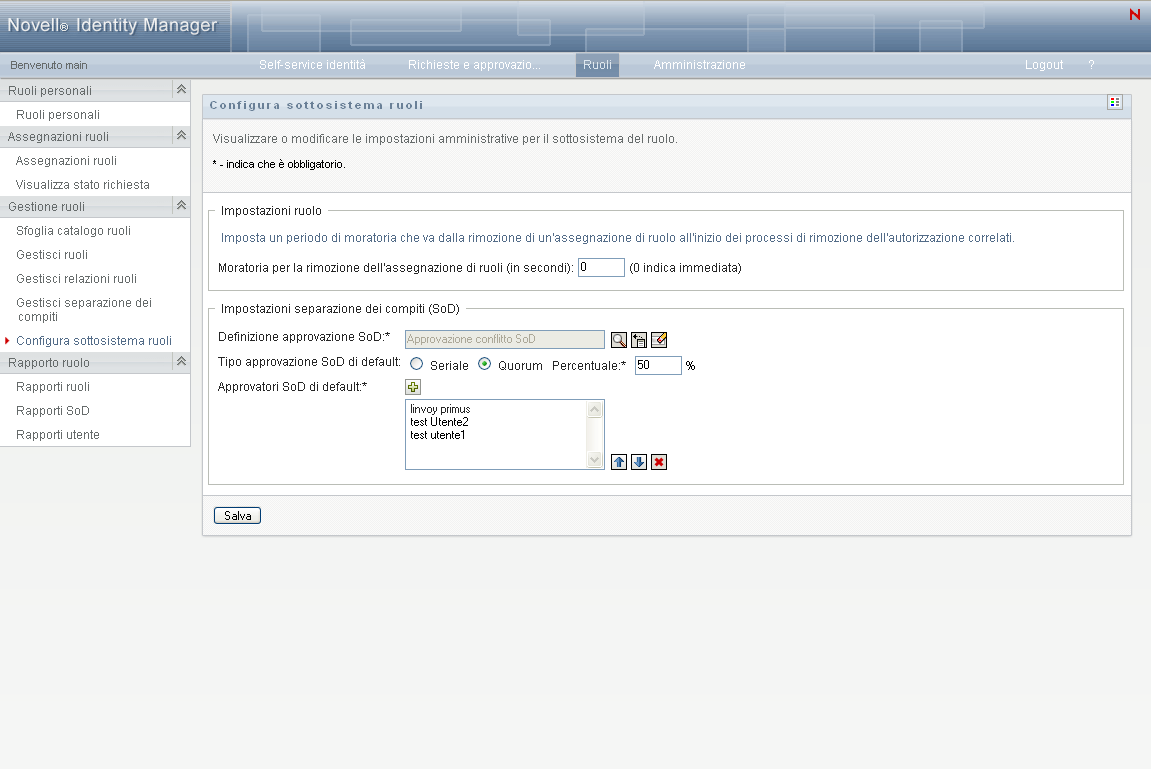 L'azione nella scheda dell'interfaccia utente di Identity Manager consente di specificare le impostazioni amministrative per il sottosistema del ruolo.