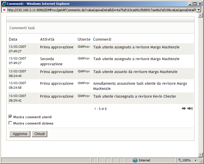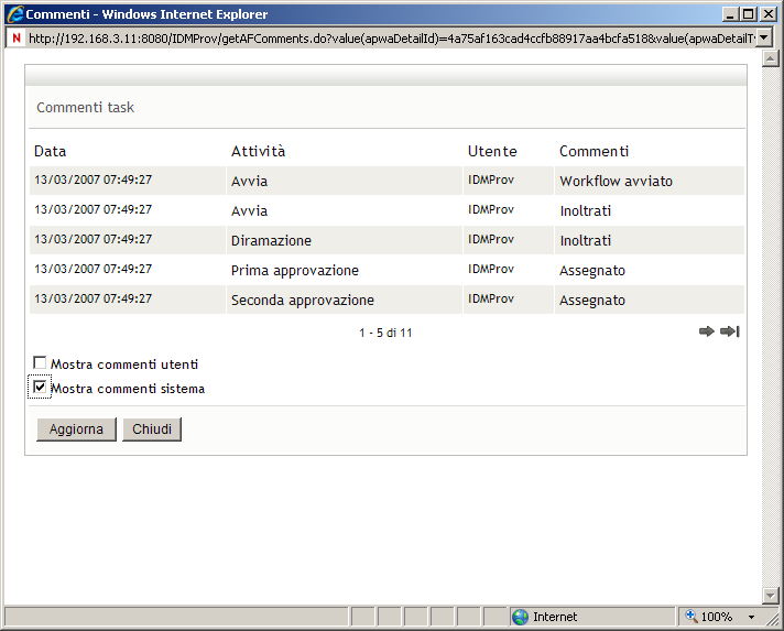 Viene visualizzata una finestra popup che consente di visualizzare i commenti di utenti e sistema. L'ordine di visualizzazione dei commenti dipende dalla registrazione dell'ora associata a ogni commento. Vengono innanzitutto visualizzati i primi commenti immessi. Per i flussi di approvazioni parallele, non è possibile prevedere l'ordine di visualizzazione delle attività elaborate contemporaneamente.