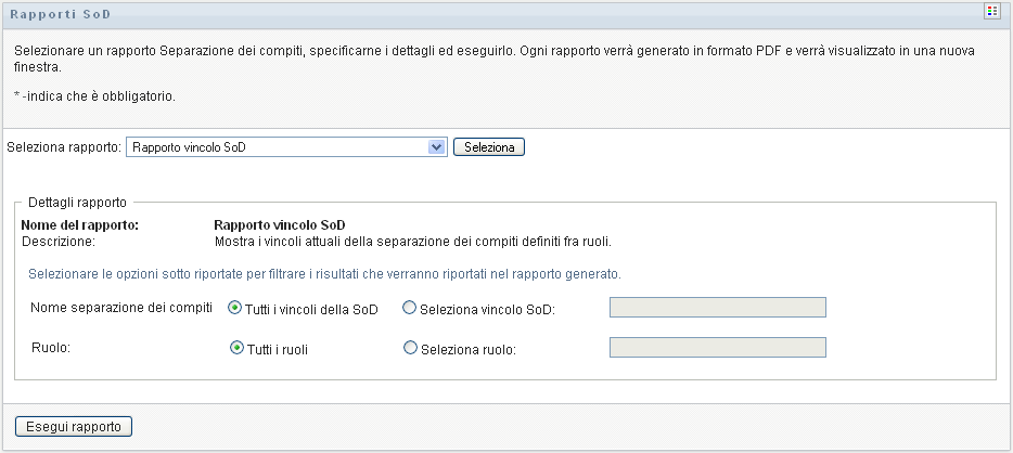 Per creare e visualizzare il Rapporto vincolo di separazione dei compiti: