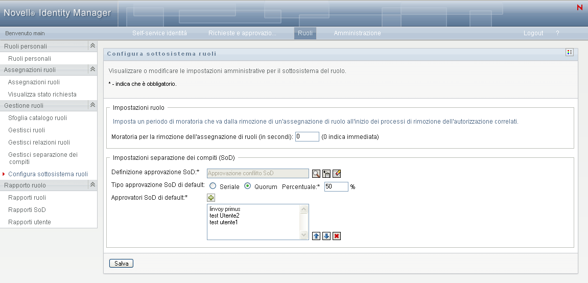L'azione nella scheda dell'interfaccia utente di Identity Manager consente di specificare le impostazioni amministrative per il sottosistema del ruolo.