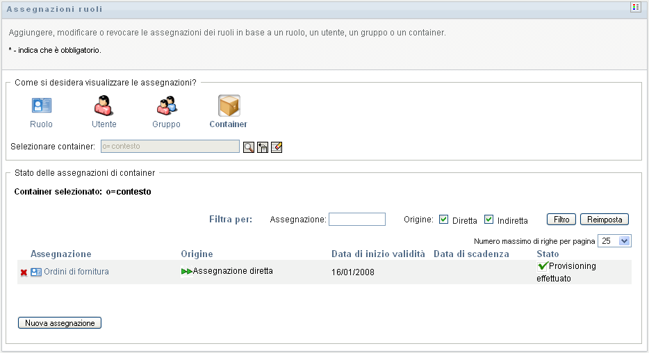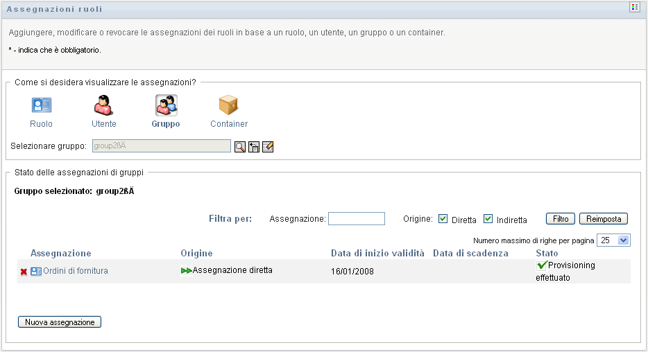 Per visualizzare solo le assegnazioni fornite indirettamente, selezionare la casella . Le assegnazioni indirette vengono ricevute dall'utente mediante una relazione ruolo oppure perché l'utente è membro di un gruppo o container.
