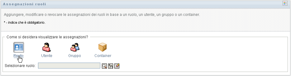 I manager dei ruoli possono richiedere l'assegnazione di utenti, gruppi e container ai ruoli per i quali dispongono dei diritti di esplorazione.
