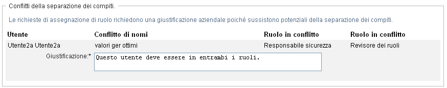 Se si verifica un conflitto di separazione dei compiti quando un ruolo è assegnato a uno o più utenti, nella parte inferiore della pagina viene visualizzata la casella . In questo caso, è necessario specificare una giustificazione aziendale per l'assegnazione del ruolo.