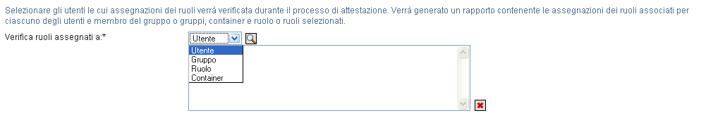 Per avviare un processo di attestazione, è necessario selezionare almeno un utente, un gruppo, un ruolo o un container. Non è tuttavia necessario selezionare un utente, un gruppo, un ruolo o un container per salvare una richiesta.
