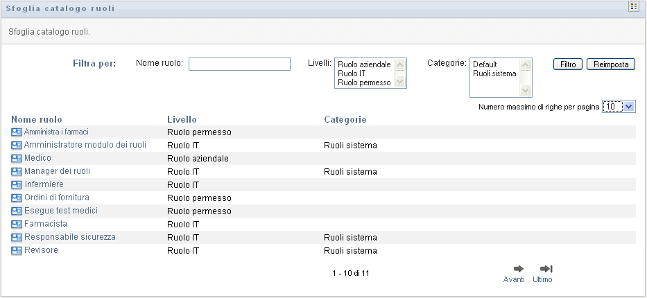 Nell'applicazione utente viene visualizzato l'elenco attuale dei ruoli nel Catalogo dei ruoli.