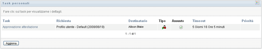 Per le richieste di risorse e di ruoli, la colonna nell'elenco dei task indica l'utente o gli utenti oppure il gruppo o i gruppi che riceveranno la risorsa o il ruolo nel caso in cui vengano fornite le approvazioni richieste. Per le richieste di attestazione la colonna indica il nome del garante, ovvero il nome dell'utente attualmente collegato all'applicazione utente.