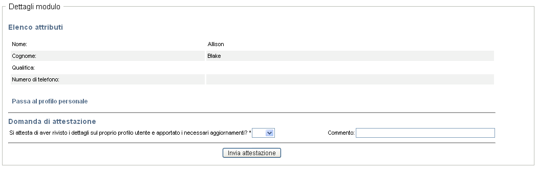 Per le richieste di attestazione, la sezione della pagina viene aggiornata per includere il modulo di attestazione. L'aspetto del modulo varia in base al tipo di attestazione. Nel caso dei processi di attestazione profilo utente, il modulo mostra i dati del profilo utente da rivedere: