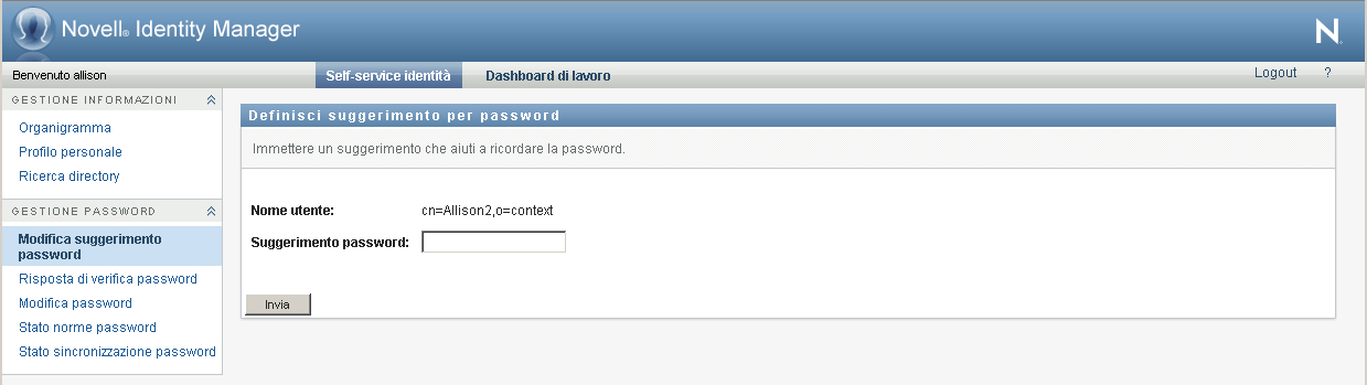Un suggerimento per la password viene utilizzato durante il login per facilitare la memorizzazione della password qualora venisse dimenticata. È possibile utilizzare la pagina Cambio suggerimento password per impostare o modificare il suggerimento.