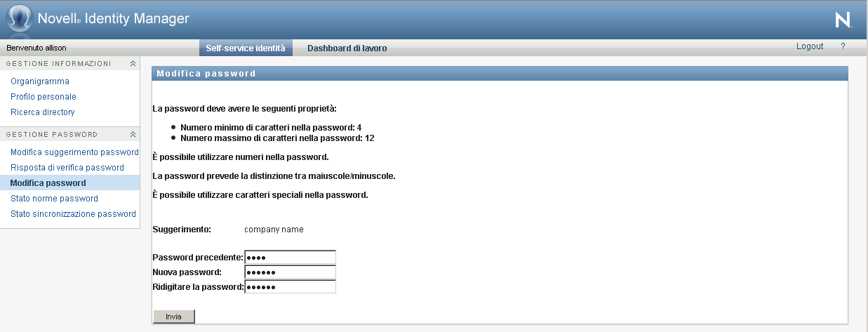 Può venire richiesto di specificare un suggerimento per la password, se l'amministratore ha configurato le norme di sicurezza per questo scopo. In questo caso, vedere Sezione 7.3, Cambio suggerimento password.