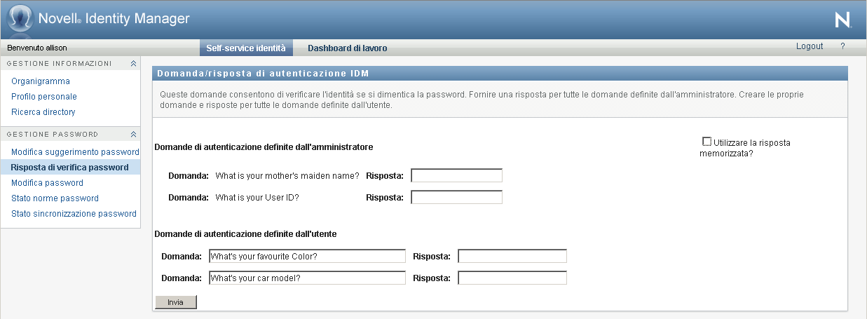 specificare le domande e le risposte valide corrispondenti (se questa operazione è abilitata dalle norme della password).