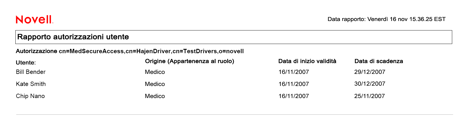 Figura 18-5 Esempio di Rapporto autorizzazioni utente: dettagli utente per ogni autorizzazione