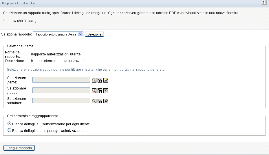 Per creare e visualizzare un Rapporto autorizzazioni utente: