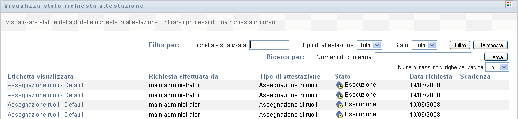 L'azione mostra tutte le richieste di attestazione, incluse quelle in corso di avvio, in esecuzione, completate o che presentano errori.