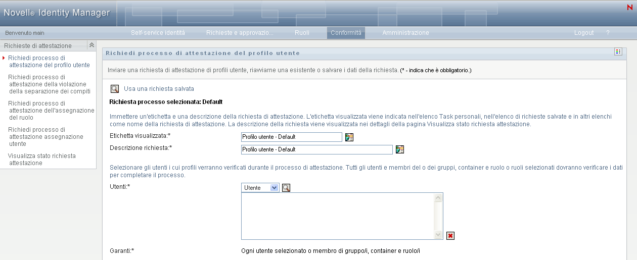 Per default, nella scheda viene visualizzata la pagina Richiedi processo di attestazione del profilo utente.