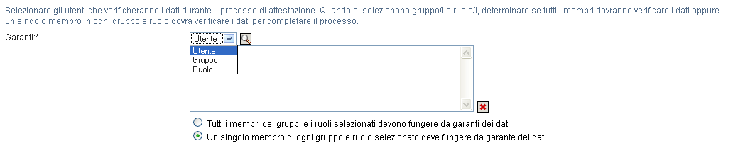 Per i garanti di gruppi e ruoli, specificare se tutti i membri devono attestare i dati oppure solo un membro di ciascun gruppo e ruolo selezionando uno dei seguenti pulsanti: