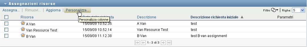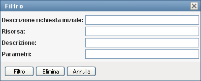 Specificare una stringa di filtro per la descrizione della richiesta iniziale, il nome della risorsa, la descrizione o i parametri associati all'assegnazione della risorsa.