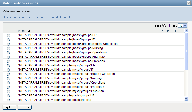 Se la risorsa richiede un valore del parametro di autorizzazione, è necessario utilizzare il selettore oggetti per selezionare il valore che si desidera utilizzare per questa assegnazione di risorsa, come indicato di seguito: