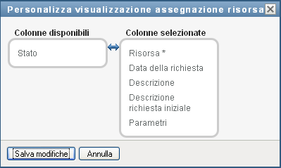 Nella sezione del dashboard è possibile selezionare e deselezionare colonne, nonché riordinarle all'interno della visualizzazione dell'elenco di task. La selezione e il riordinamento delle colonne sono controllati dalle impostazioni disponibili nella finestra di dialogo Personalizza visualizzazione assegnazione risorsa. Quando si modifica l'elenco di colonne o si riordinano le colonne, le personalizzazioni vengono salvate in Identity Vault insieme con le altre preferenze dell'utente.