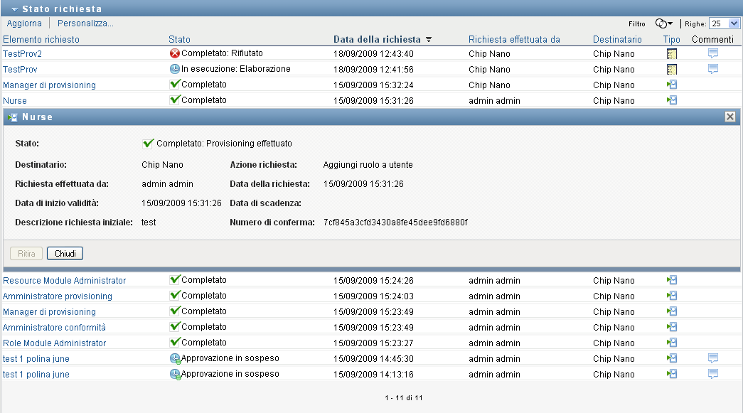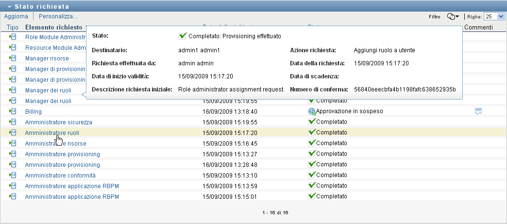 NOTA:se l'orologio di sistema del server in cui risiede il driver servizi dei ruoli non è sincronizzato con l'orologio di sistema del server in cui è in esecuzione l'applicazione dell'utente, lo stato della richiesta può risultare diverso negli elenchi Stato richiesta e Assegnazioni ruoli. Ad esempio, se si richiede un'assegnazione di ruolo che non richiede approvazione, è possibile che lo stato venga visualizzato come Provisioning effettuato nella sezione Stato richiesta e come Attivazione in sospeso nella sezione Assegnazioni ruoli. Se si attende circa un minuto, è possibile che lo stato nella sezione Assegnazioni ruoli venga modificato in Provisioning effettuato. Per assicurarsi che lo stato venga sempre visualizzato correttamente nell'applicazione utente, controllare che gli orologi del sistema siano sincronizzati in modo adeguato.
