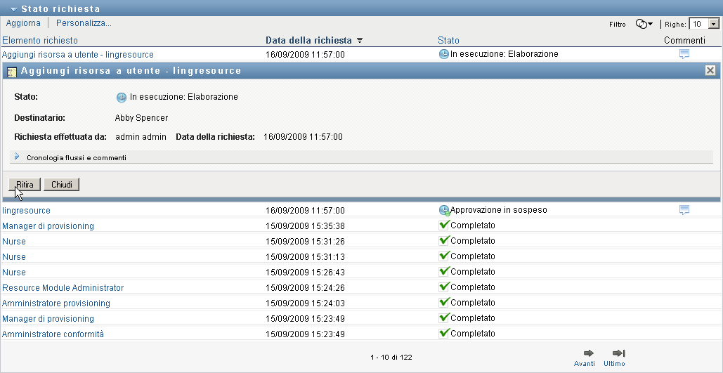 Tale elenco include richieste attive, nonché richieste che sono già state approvate o rifiutate. L'amministratore può gestire il tempo di permanenza dei risultati del workflow. Per default, il sistema di workflow mantiene i risultati di workflow per 120 giorni.