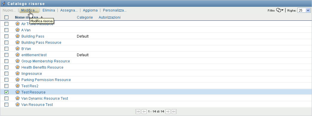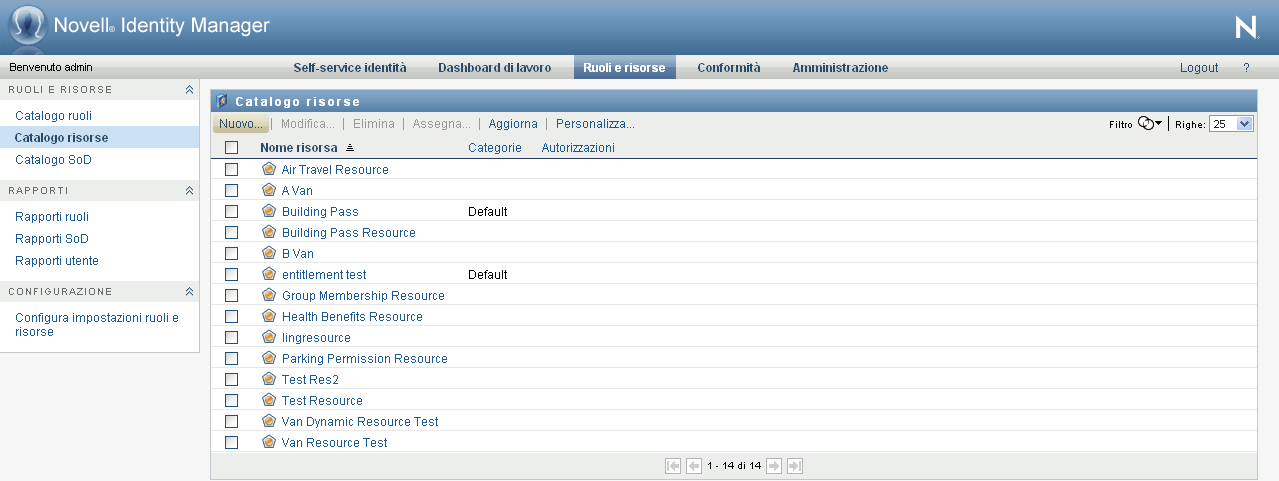 L'azione nella scheda dell'interfaccia utente di Identity Manager consente di visualizzare le risorse definite in precedenza nel catalogo. Consente inoltre di creare nuove risorse e modificare, eliminare e assegnare risorse esistenti.