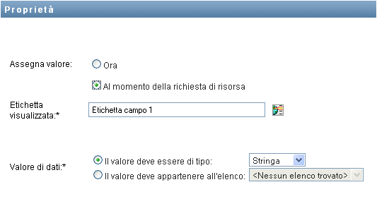 Fornire un'etichetta di visualizzazione per il campo e specificare se il valore deve essere di un particolare tipo di dati o essere selezionato da un elenco.