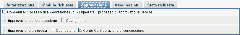 Se la casella di controllo è selezionata, il processo di approvazione ruoli ignorerà sempre il processo di approvazione risorse ogniqualvolta la risorsa viene associata a un ruolo. Una volta approvato il ruolo associato, viene eseguito automaticamente il provisioning della risorsa, senza alcuna necessità di approvazione.