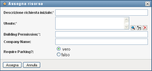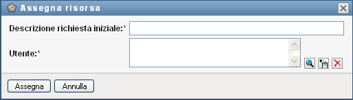 I campi e sono obbligatori e presenti in tutti i moduli di richiesta di risorse. È possibile utilizzare il selettore oggetti per selezionare gli utenti per l'assegnazione delle risorse.