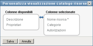 Il consente di selezionare e deselezionare colonne le colonne nonché di riordinarle all'interno della visualizzazione dell'elenco dei task. La selezione e l'ordinamento delle colonne sono controllati dalle impostazioni disponibili nella finestra di dialogo . Quando si modifica l'elenco di colonne o si riordinano le colonne, le personalizzazioni vengono salvate in Identity Vault insieme con le altre preferenze dell'utente.