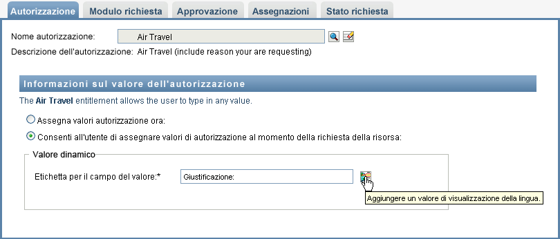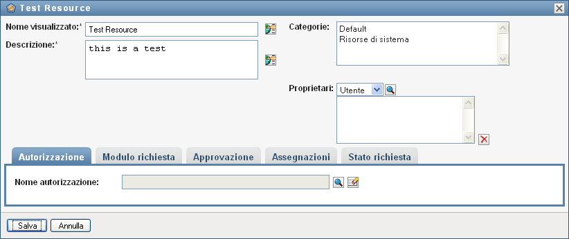 Specificare un'etichetta che l'utente visualizzerà al momento della richiesta della risorsa.